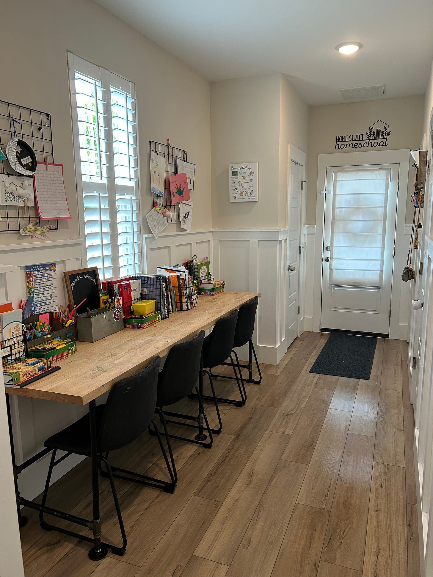 We don’t have a homeschool room, but my husband built us a beautiful desk with 4 chairs in our back hallway. The kids have a place for all of their school books, art supplies, and that is where we display some of their work. It is wise to have a place to keep everything. We keep all of the curriculum books for read-alouds and lessons on a bookshelf in my room mostly because I don’t want them to get misplaced, but when we are currently using them, they are on the desk. SPOILER ALERT: We barely ever all sit back there and do work. The beauty of homeschooling is CHOICE. The kids can sit wherever they want – the kitchen island, the dining room table, the couch, the recliner, the bed! Literally wherever they want (as long as they can write legibly/neatly enough!). I love having somewhere for all of the supplies to be when not in use though so having a home for everything is vital.